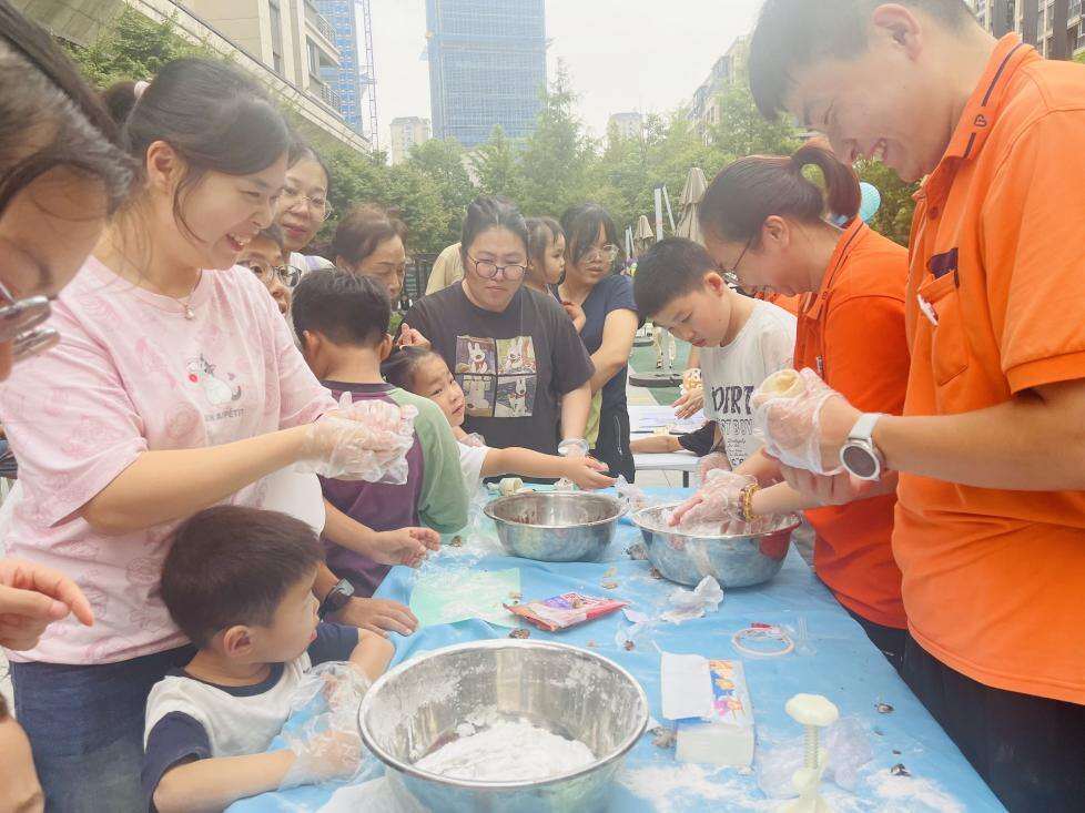 与此同时,中秋游园活动也在热火朝天地进行中。月饼制作区围满了亲手制作冰皮月饼的家庭。家长们和孩子一起动手,揉面、包馅、压模,体验传统美食的制作乐趣。做好的月饼可以带回家分享,也可现场品尝。