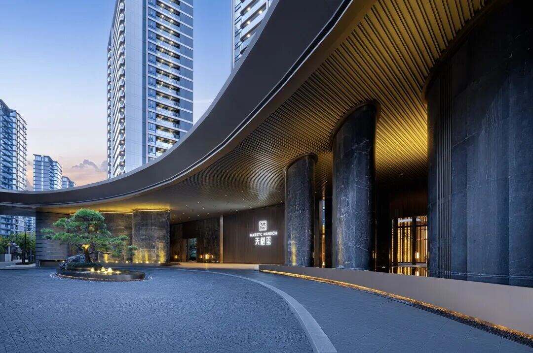 宽约60米、高约6米的北区入户门头,迎面左右各布置3根直径约4.2米的爱马仕灰奢石梭形柱,以传统文化里“金玉满堂”为灵感,尽致奢华,既拉开了鼎豪人居的仪仗感,又将温州塔尖家族的望族门风显露无疑。