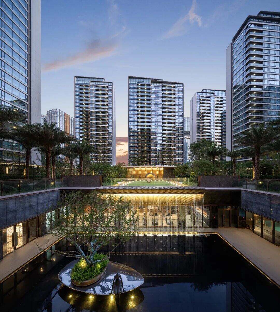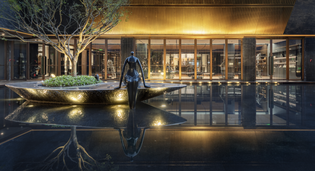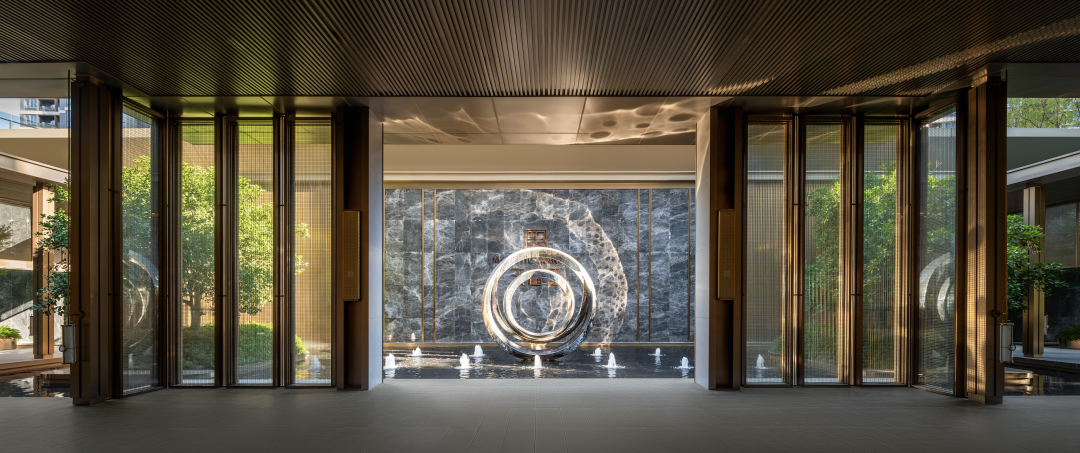 再行至入户处,镜面水院静静铺开 —— 既承载着温州人 “以水为财” 的处世哲学,又温柔滤去CBD的喧嚣,让人从城市的快节奏中抽离,完成心境的转场。