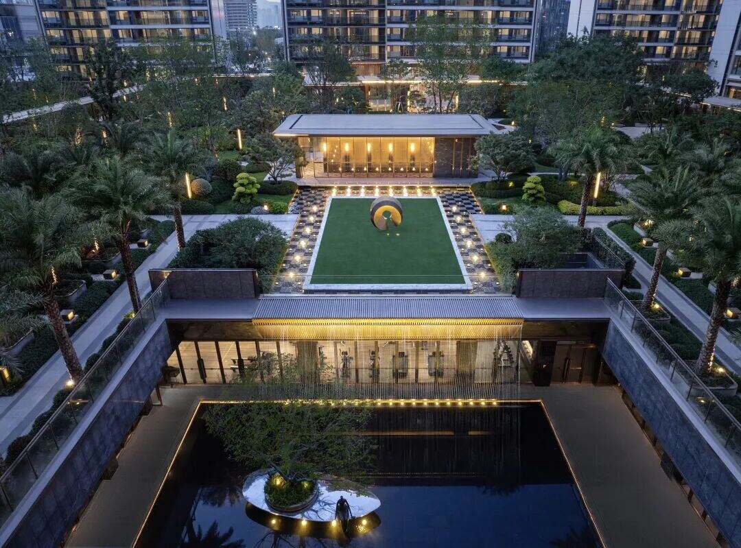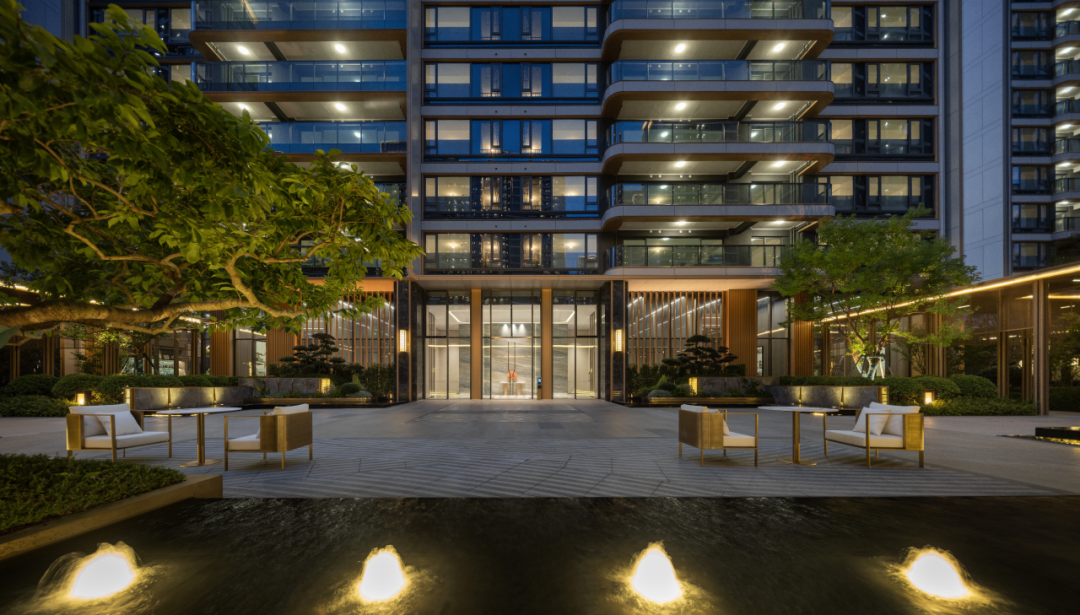 穿过对标宝格丽酒店的架空层大堂步入社区,约1.8万方中央庭院花园更让人眼前一亮:它汲取欧洲传奇庄园的造园灵感,却深度适配温州人的生活习惯,25米宽的门廊形成天然框镜,将下沉水院、观景凉亭与第三重院落串联成雅致中轴。
