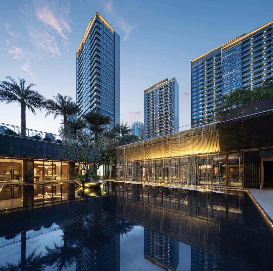 再往深处的下沉庭院艺术会所,更是 “当代瓯越山水会客厅”—— 超5米人工飞瀑奔涌,复刻瓯江潮涌的城市记忆;国宝级红枫四季换彩,如活态艺术品点缀其间;U 形爱马仕灰大理石立柱搭配黑金沙光面池底,把温州工匠精神与世界顶级审美揉在一起,每一处细节都透着高端人居的质感。
