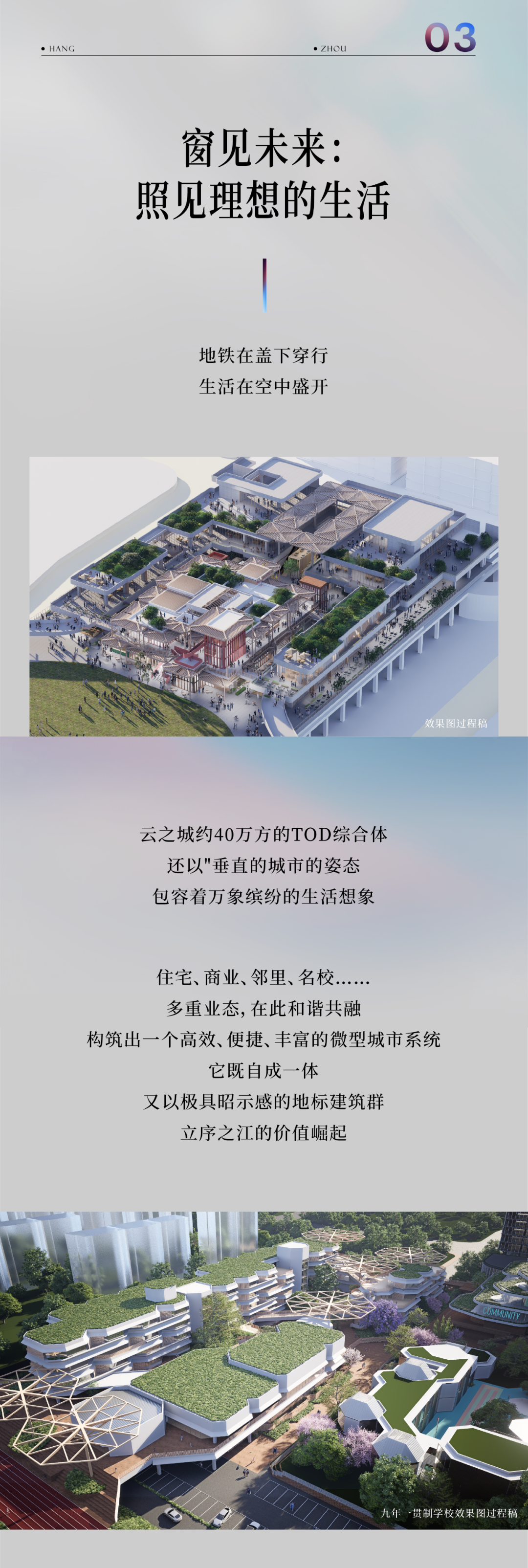 本项目推广案名为建发·之江城投·杭铁开发 | 云之城,备案名拾光云之城,开发商:杭州兆金房地产有限公司。本资料为要约邀请,不作为要约或承诺,相关内容不排除因政府相关规划、规定及开发商调整而发生变化,买卖双方的权利义务以双方签订的《商品房买卖合同》及政府最终审批文件为准;对项目周边环境、交通、教育及其他配套设施的介绍,旨在提供相关信息,不意味着本公司对此作出了承诺;本宣传不对学区及入学条件做任何承诺,学校划分及入学条件以政府相关部门最终批准方案为准。本资料效果图为过程稿仅供示意,存在后续修改可能,最终以双方签订的《商品房买卖合同》及实际交付为准;公司保留对宣传资料修改的权力,敬请留意最新资料。建发国际全国服务热线 400-846-3636。本资料发布日期2025年9月,有效期1个月。