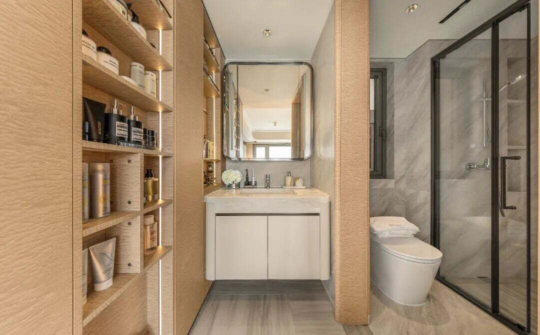 北侧设备阳台也经过巧妙重构,不再是单调的功能区域,而是转变为家居的自然延伸。而所有管道、设备与收纳,整体规划尽可能隐于无形,空间回归纯净、开阔,为人而设,因生活而生动。