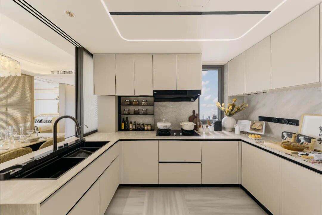 传统厨房往往是封闭、孤立的存在,操作者不得不与家人朋友隔绝。保利天奕为了打破这一格局,大量使用半开放式厨房的设计,通过洄游式动线+U型布局,将厨房与客餐厅有机串联,并创新性地采用水槽对外设计,让操作者洗切备餐时也能与家人交谈、注视孩子的活动;我们还在所有的首开户型中,做到了不锈钢烟道外置,真正实现“无烟厨房。”让这方天地,成为融合烹饪、交流、陪伴、健康的复合场域。