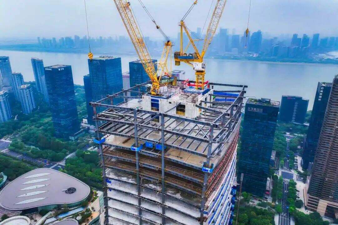杭州绿发中心地处钱江新城核心区域,位于来福士与万象城之间,总建筑面积约43万平方米。项目规划为涵盖总部办公、江景藏品及旗舰商业等业态的大型城市综合体。此次结顶的T4办公楼为四幢塔楼之一,南侧三幢为高度约175-190米的江景藏品。