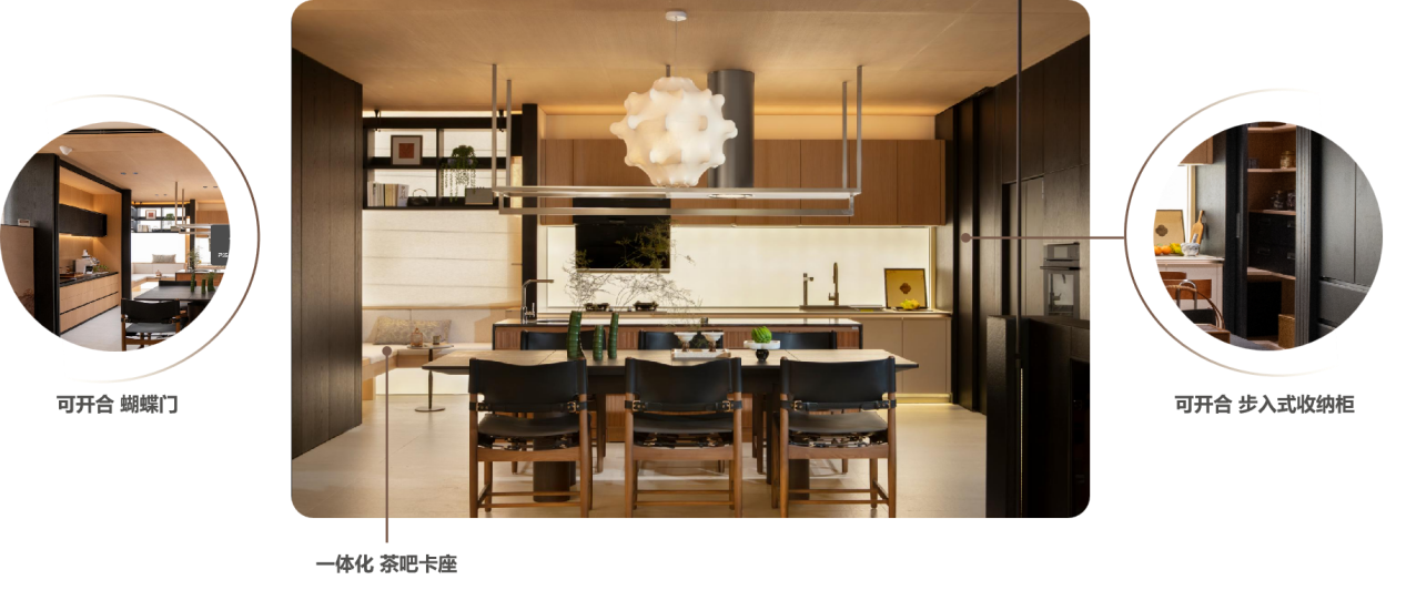 在浙江省“好房子”展的新建类样板间中,绿城家作为参建单位,深度践行可变理念。例如,厨房区域的“蝴蝶门”成为点睛之笔:关闭时茶吧区悄然隐形,保持空间整洁;打开时,茶吧与卡座餐厅连为一体,瞬间转换为社交聚会角。相邻的步入式收纳柜则以“超能装”设计,让锅碗瓢盆各归其位,彻底解放台面。而多功能区的移动隔墙,通过语音智控实现三种模式切换——全开放的家庭活动区、带隐藏下翻床的私密客房、半开放的书房与健身区,无缝契合现代家庭多元化的生活场景。