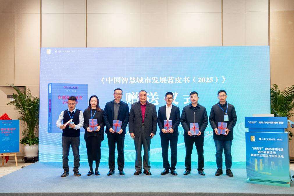 王国平主任、薛安克会长为新书《中国智慧城市发展蓝皮书(2025)》揭幕。王国平代表浙江省城市治理研究中心向战略合作单位赠送新书。