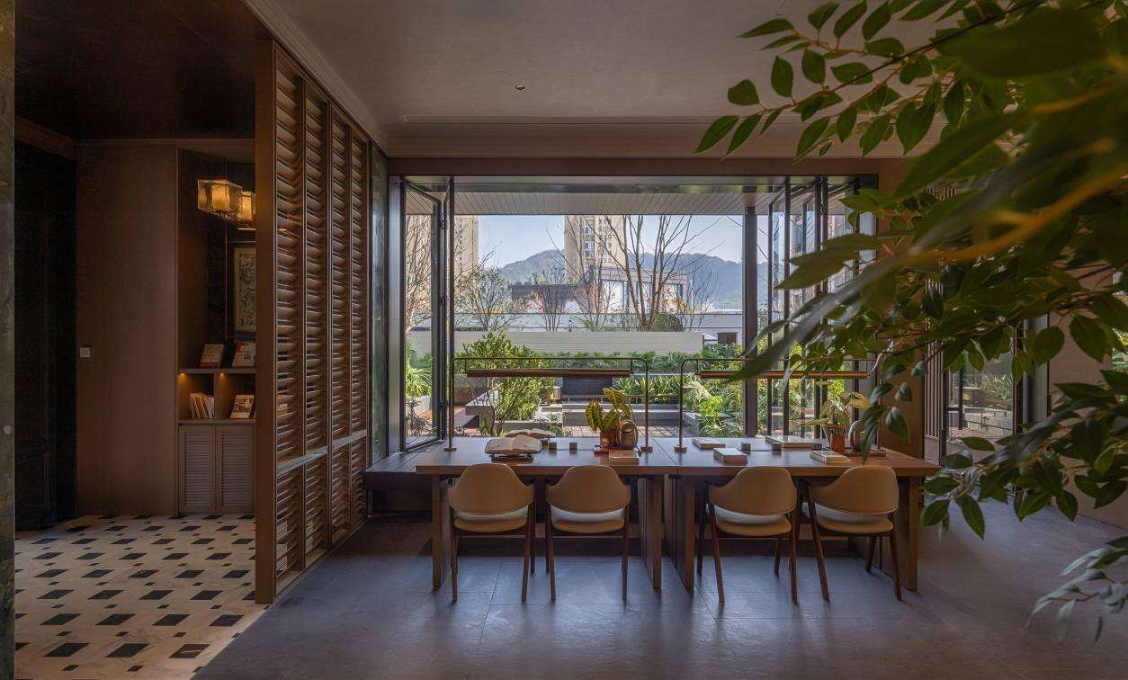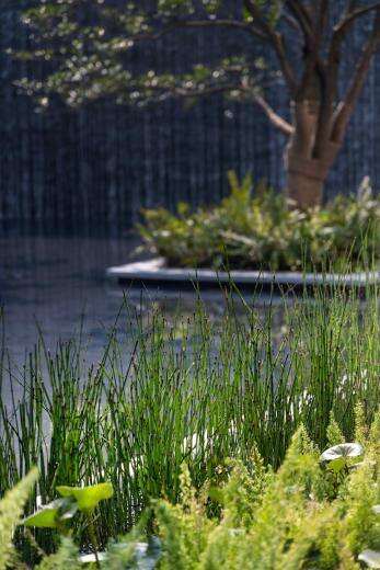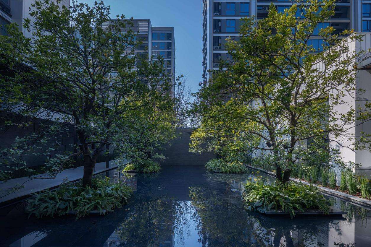 “水榭林间”倒影、流水、室内、边界交融在一起,共同形成了衬托水面之上大树的画框,创造平静、稳定的氛围,强调纯粹精致的表达与空间秩序。
