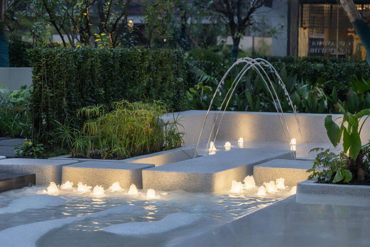 “寻溪趣园”则赋予戏水池和林下空间以休闲和社交属性,水景+戏水池形式,不仅有观赏功能,还可供业主休闲。可参与式生活场景,结合层叠的树木和倒影,营造出公园度假的生活体验。