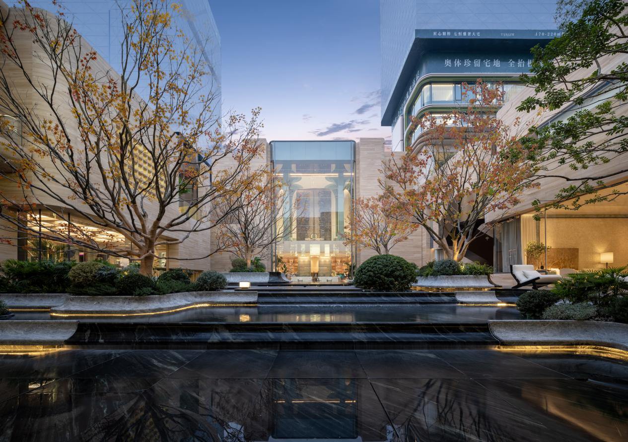 一个是奥体核心的“杭州保利·天珺”。在这样一个充满现代张力与赛事基因的板块,保利没有选择做冰冷玻璃幕墙的堆砌,而是反其道而行之,取“只此青绿”为美学底色,将宋式雅韵温柔地嵌入城市肌理。从“钱塘春芽”般的建筑立面,到融入玉石、铜艺、陶瓷、折扇等文化符号的园林与空间,天珺把杭州的在地文化变成了可居、可游、可赏的日常 。它证明了,顶豪的终极高度,不是尺度的奢阔,而是文化的温度。