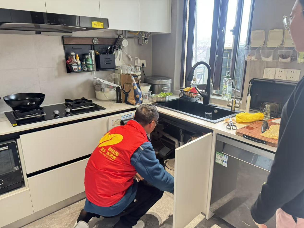 3月5日学雷锋纪念日当天,湖州片区党支部充分发挥党员先锋模范作用,组织工程党员志愿者服务队深入社区,开展“我为群众办实事”实践活动,以专业技能破解业主生活中的“急难愁盼”。在云启里小区,志愿者排查时发现一户业主家中监控设备故障,立即携带工具登高作业,细致排查线路、调试设备,快速让家庭安防恢复“在线”;面对另一户业主厨房下水管道堵塞、积水反渗的难题,志愿者俯身钻入狭小橱柜,耐心清理管道内油污杂物,彻底解决管道堵塞困扰,用专业与细心赢得业主一致认可。