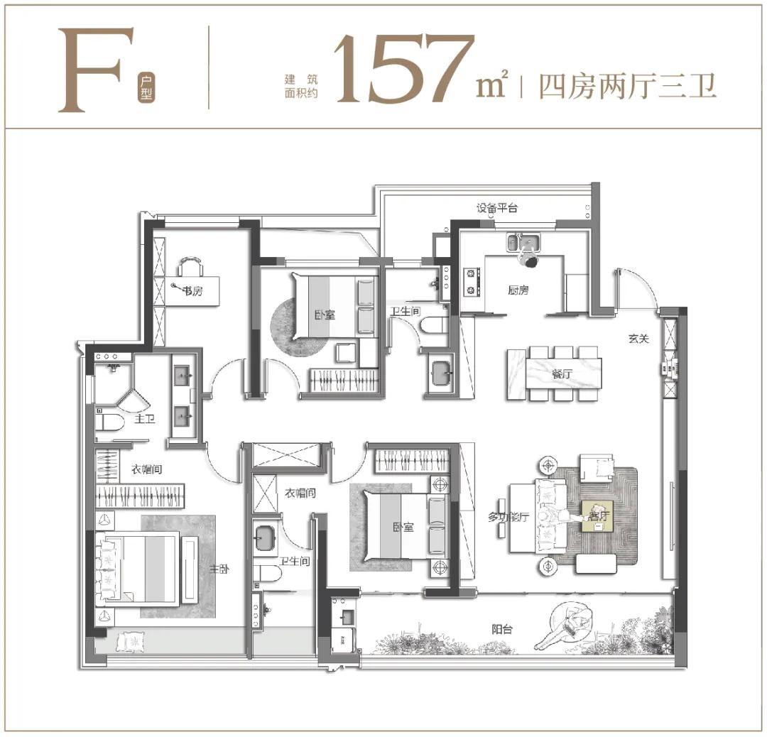 更值得称道的是,约157㎡户型配备双套房主卧设计,主卧自带独立卫浴与专属衣帽间,其中主卫采用双台盆设计,告别早晚洗漱拥挤的困扰,兼顾实用性与尊崇感;南向套房次卧,同样配备衣帽间与独立卫浴,可作为孩子或者父母的专属空间,让更多家人拥有独立舒适的居住空间。