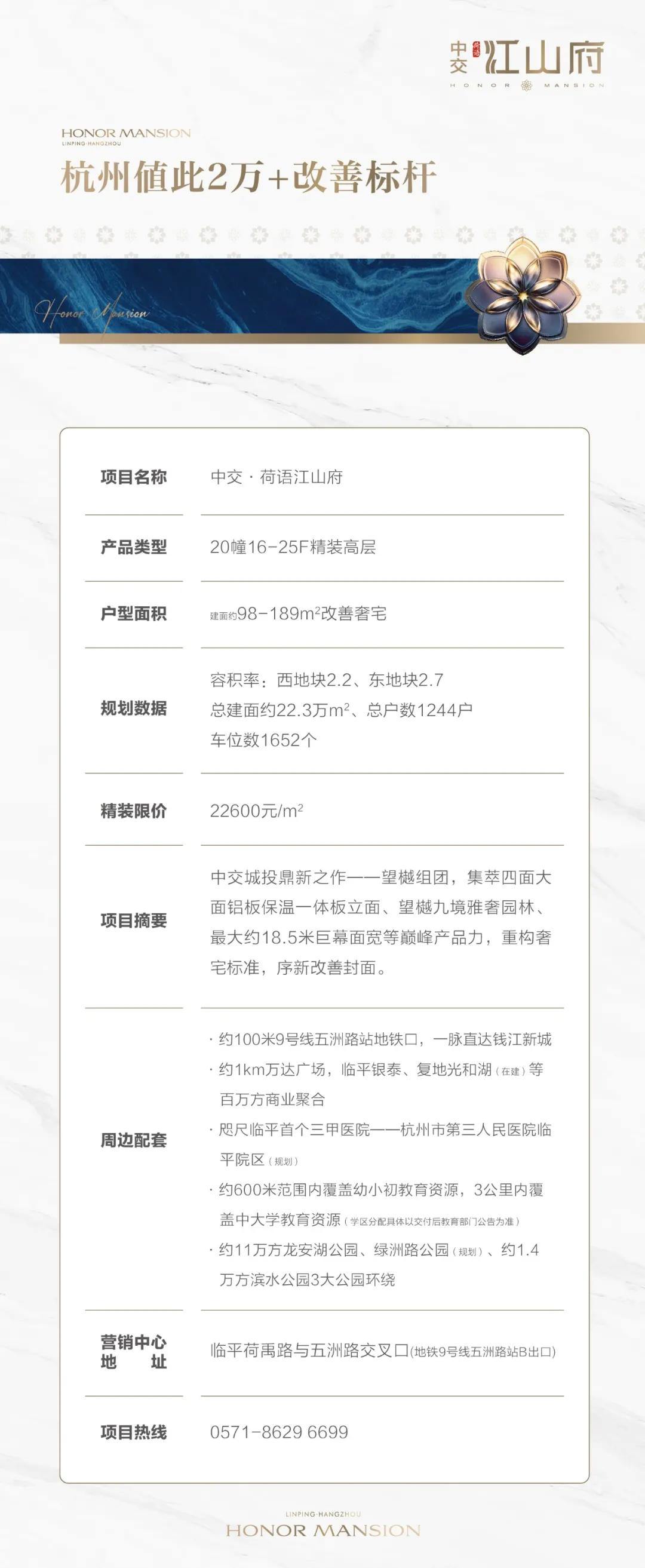 免责声明:本项目开发公司为杭州中宜杭城置业有限公司,本资料为要约邀请,相关内容不排除因政府相关规划、规定及开发商未能知晓的原因发生变化,本公司保留对宣传资料修改的权利,敬请留意最新资料,对项目周边环境、交通、教育、商业及其它配套设施的介绍,旨在提供相关信息,不意味着本公司对此作出承诺。本资料中所有资料,包括项目效果图、插图、文字描述等仅供参考识别或分享交流之用,买卖双方的权利及义务以双方签订的《商品房买卖合同》及其附件约定为准。本项目推广名为“荷语江山府”,核准地名为“荷语江山府”。预售证号:临平房预许字(2024)第00415号、临平房预许字(2024)第00495号、临平 房预许字(2025)第00041号、临平房预许字(2025)第00091号。本宣传资料制作日期为2026年4月。