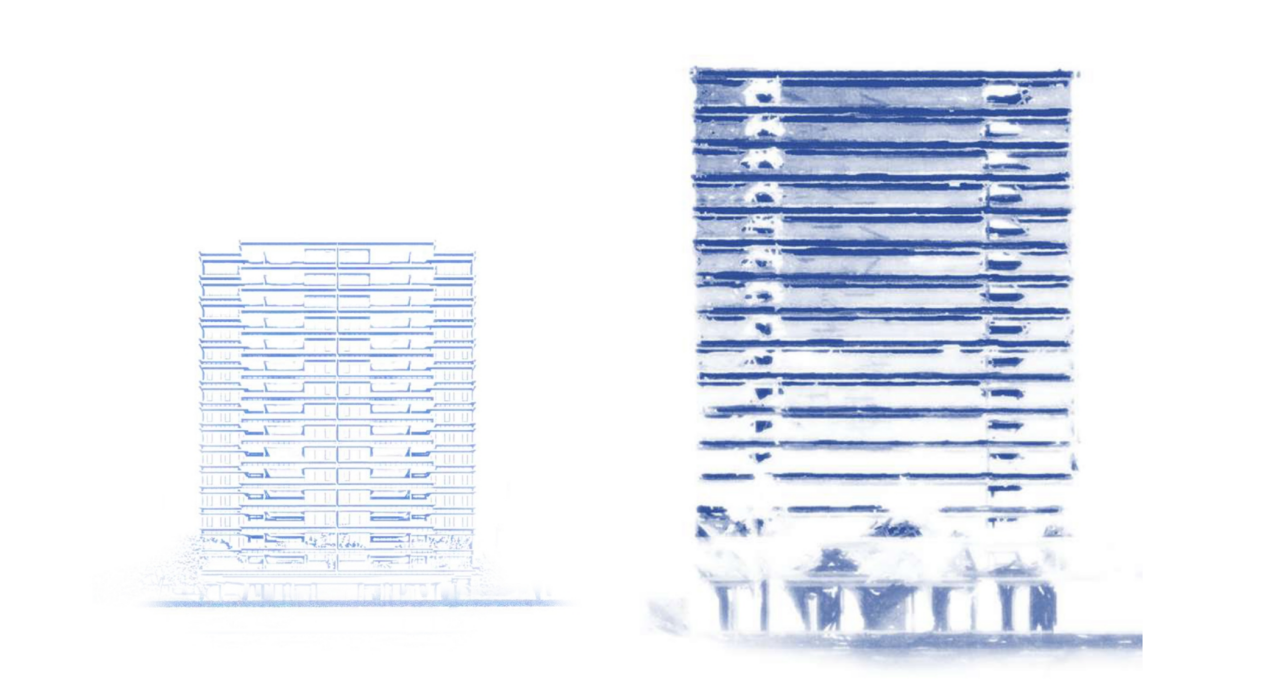高层建筑外立面融合铝板、均瓷陶砖及石材等多种材料,兼具铝材线条的轻盈挺拔、均瓷陶砖温润多变的光泽感,以及石材的厚重沉稳,形成丰富的视觉层次与独特的艺术张力。