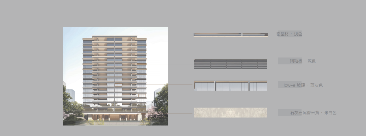 设计师以现代简洁的立面构图重塑传统意象,以蓝灰色通透玻璃与米黄色温润石材谱写主旋律,通过铝板、玻璃、石材的精妙组合,为现代建筑注入古典主义的端庄与温和。层间线条更精选专属烧制的金属釉面均瓷陶砖,构建出富有层次的艺术表达。