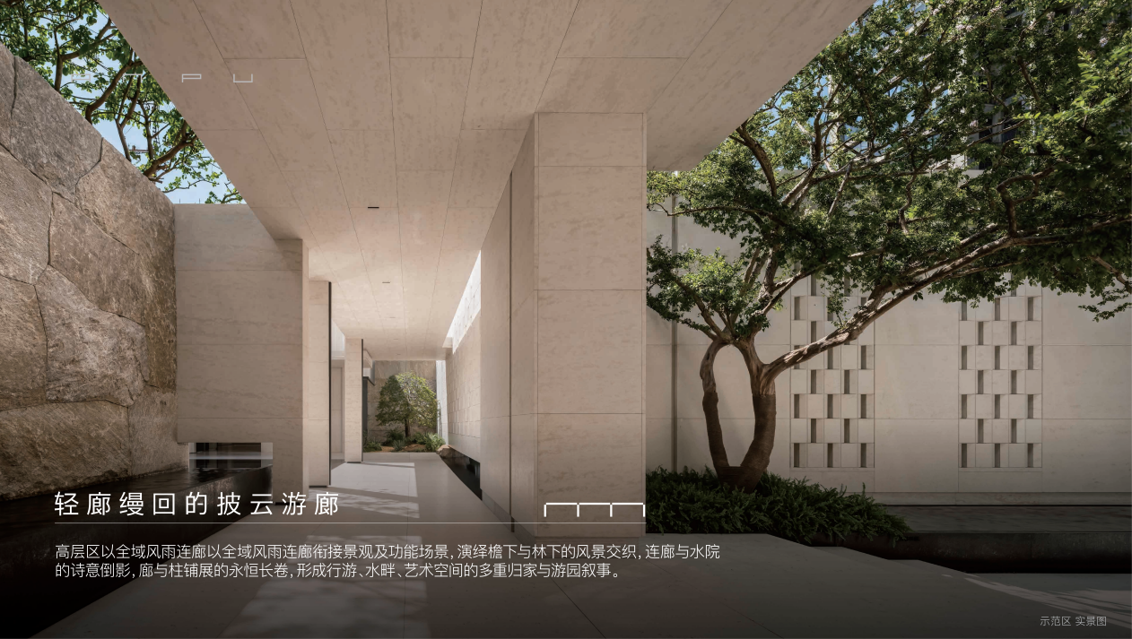 整个园区的景观以“一轴两区四园两巷”为空间序列,构建从城市喧嚣渐次过渡到私密静谧的递进式体验。多重水景及中央水院的立体营造、高层区全域贯通的披云游廊,将生活场景转化为一场沉浸式的美学漫步。