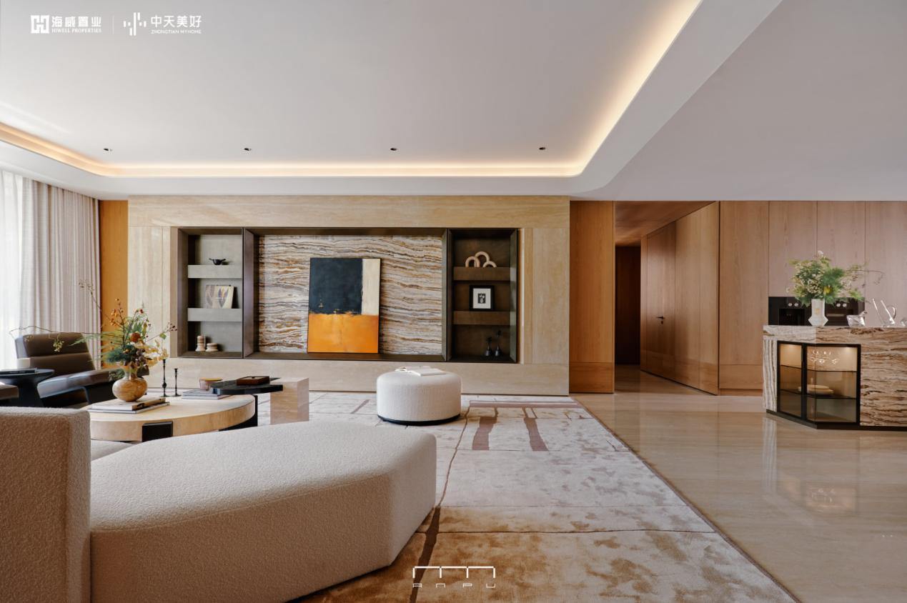 建筑形制上,项目以现代简洁的立面构图重塑传统意象,通过精致细节与温暖米色石材的巧妙搭配,形成独具辨识度的建筑符号。墙面保留材质的天然肌理,地面铺陈沉稳色泽。摒弃繁复装饰,为生活留出丰盈的空白。