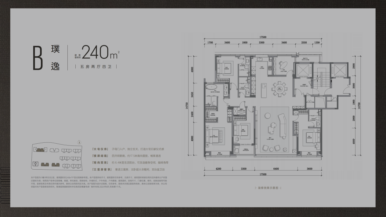 建面约210㎡五房两厅三卫:经典四叶草布局,四个卧室分居四角,互不干扰。南向双套房设计,主卧面宽约4米,配有独立衣帽间,主卫配备劳芬、当代卫浴五金。客厅开间约7.5米,连通同宽阳台,采光面极致开阔。入户玄关,提前预设收纳空间,解决大宅收纳痛点。