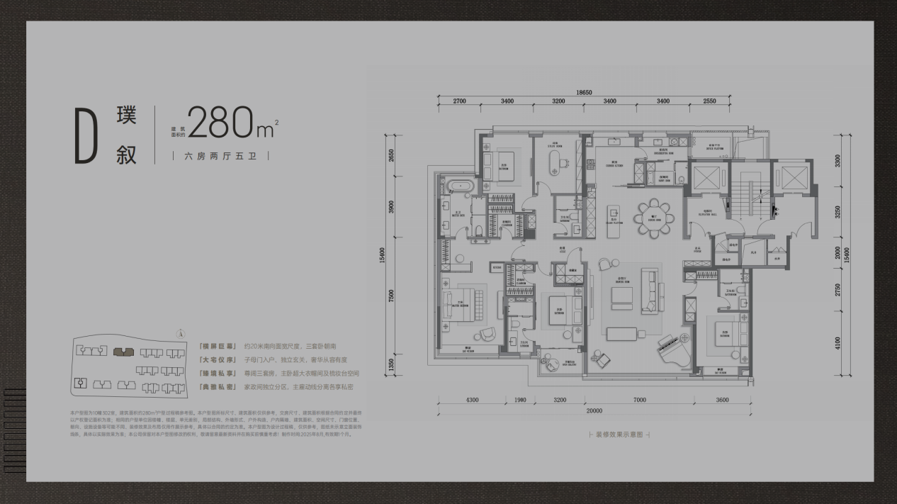 高层主力户型:约210㎡、240㎡、280㎡,全系五房标配