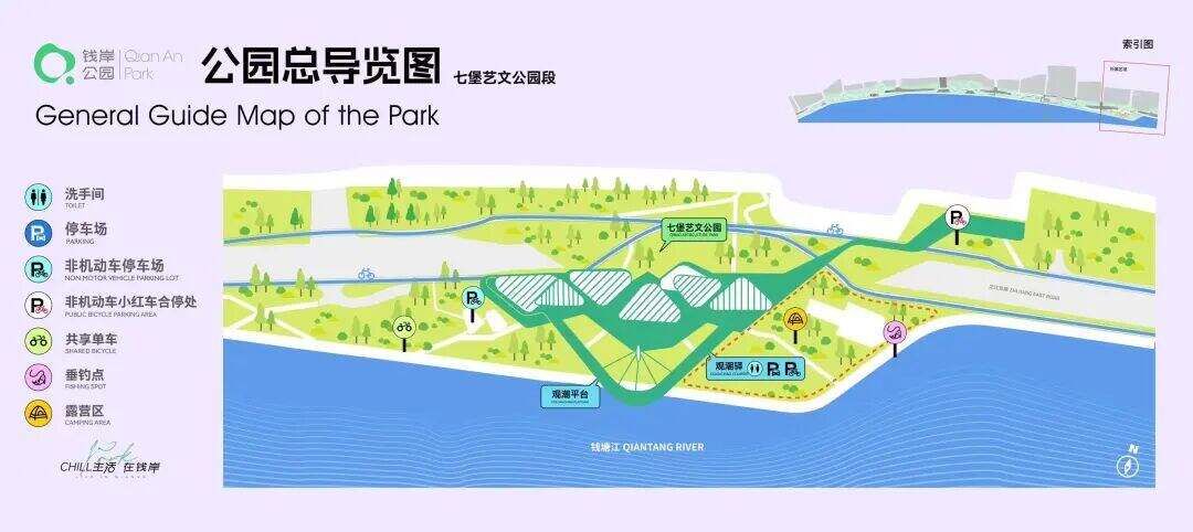 观潮驿东侧草坪还可以露营,但请务必安全使用露营装备,并注意消防安全。同时东侧江堤设有垂钓点,请文明垂钓,共同保护水域生态。