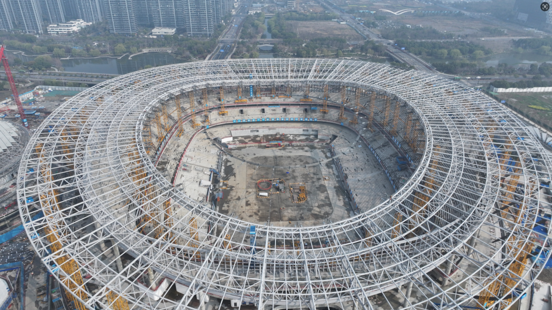 近日,余杭国际体育中心项目建设现场再传捷报,项目索结构张拉圆满完成,场馆“筋骨”已基本成型!