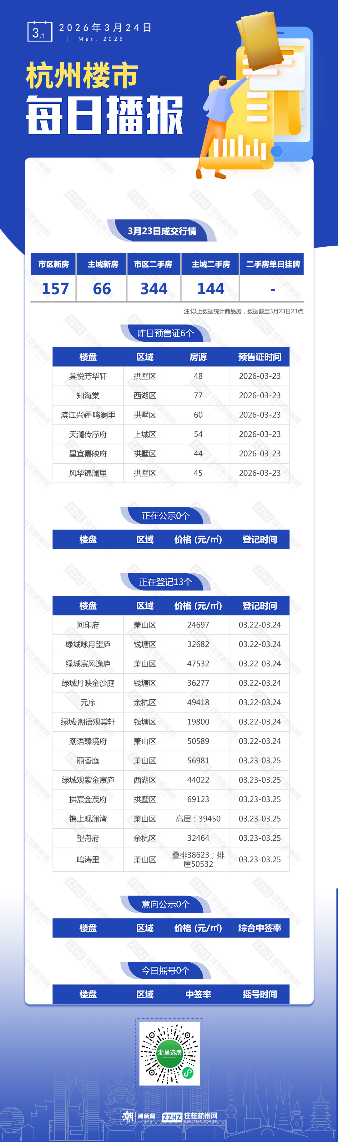 3月24日,杭州新盘7盘预售,13盘报名中