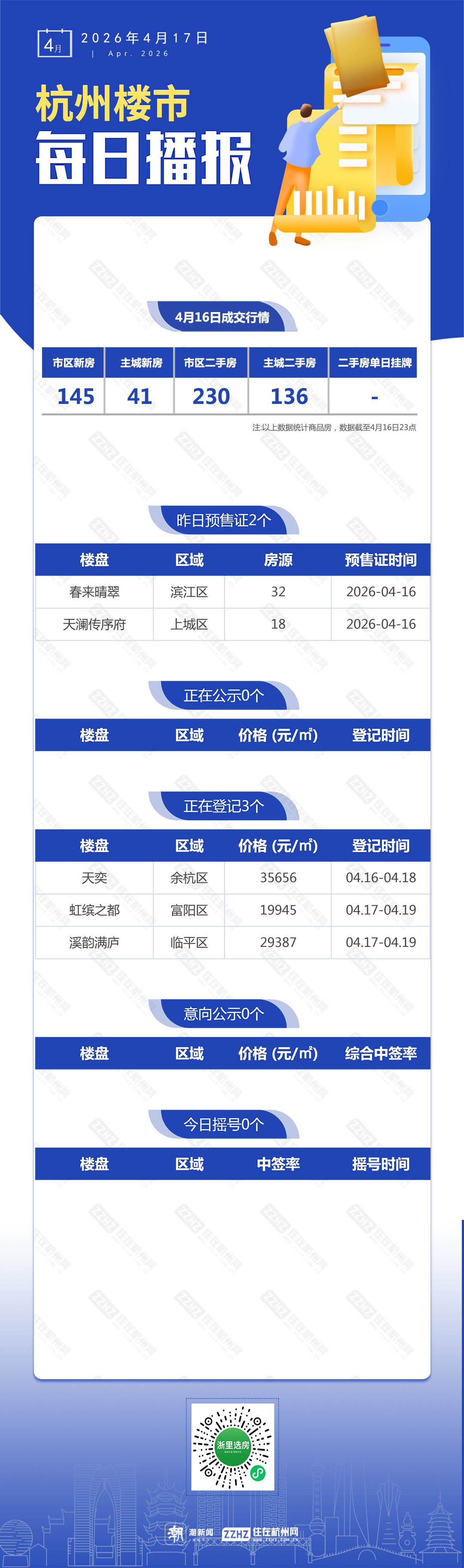 4月17日,杭州新房6盘预售,3盘报名中