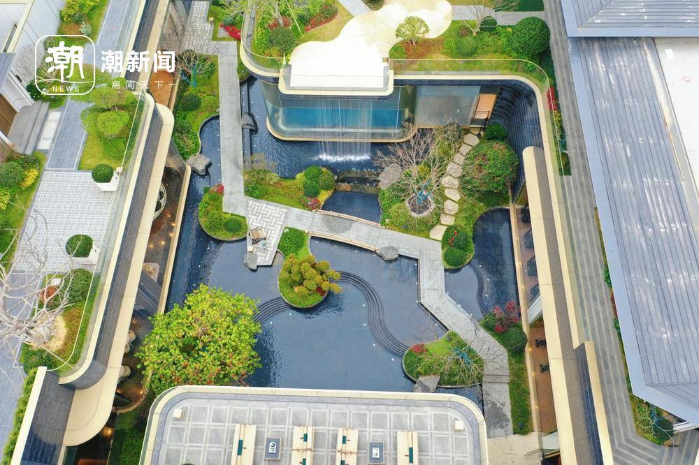 俯瞰角度,这个项目采用了当下比较流行的多维立体景观,园区内约7000㎡中央园林,水系占比达 20%。