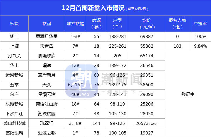 12月首周,场上有10余个新盘报名登记。12月2日,位于钱江新城二期的蕙澜月华里率先公示了二开报名登记情况,结果显示:有0户购房登记家庭。