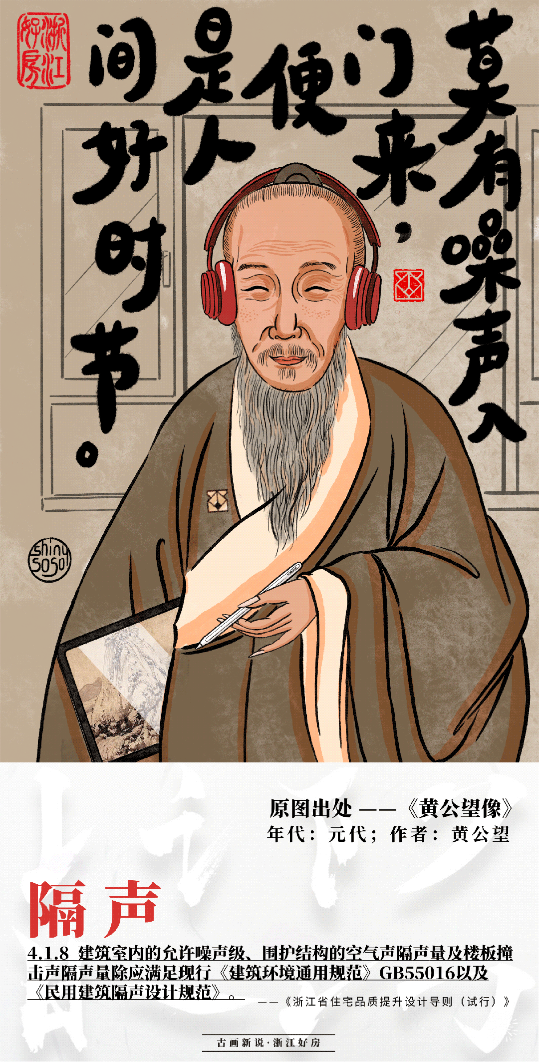 在《古画新说·浙江好房》文创展区,漫画作品中的黄公望戴着耳机徜徉在富春山居之中,“莫有噪声入门来,便是人间好时节”,演绎了隔声隔音的重要性。