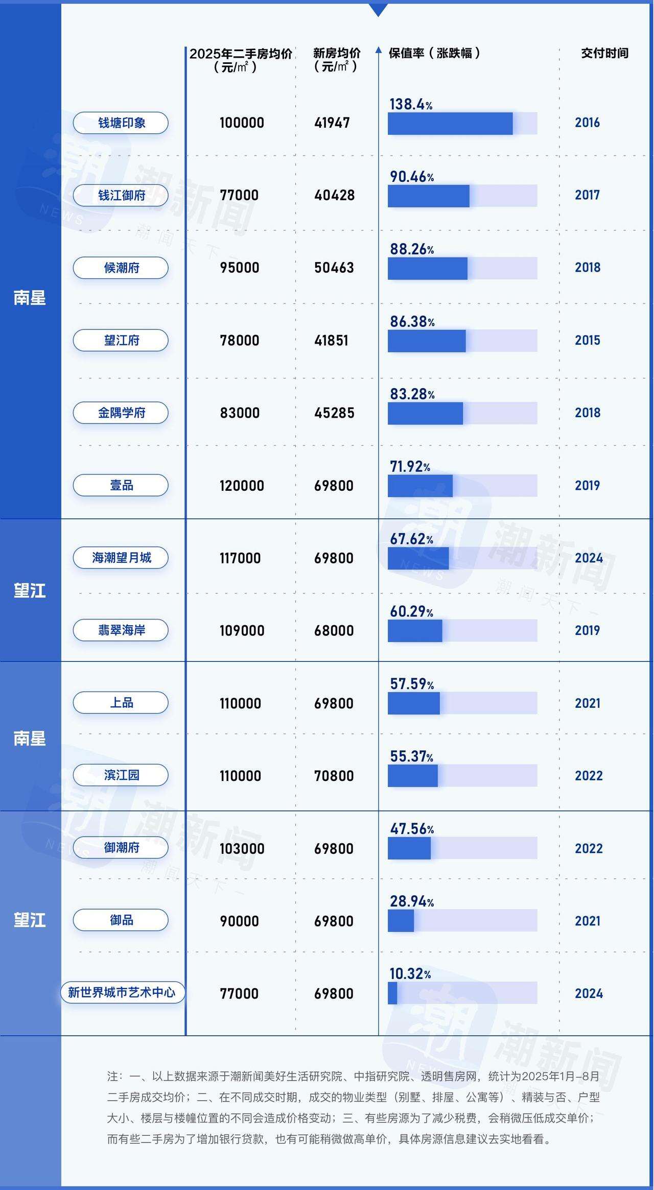 住在杭州网10月2日讯(记者 黄磊 詹慧雯)南星桥和望江新城,是杭州传统的豪宅区。在过去十年左右时间里,其交付小区二手房价保值率如何?潮新闻美好生活研究院选取了10余个次新小区房价样本,为大家做参考。