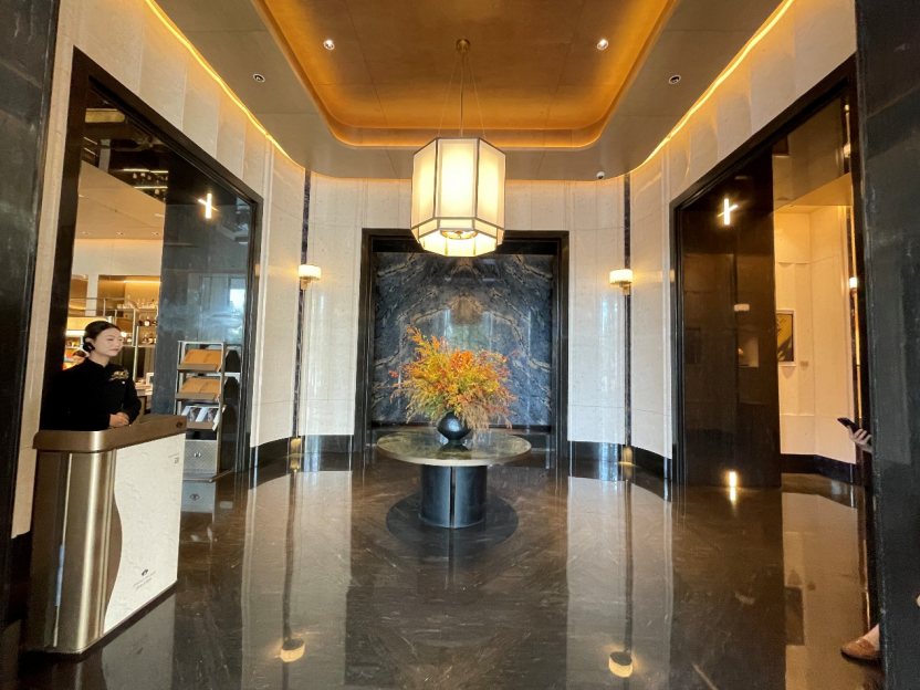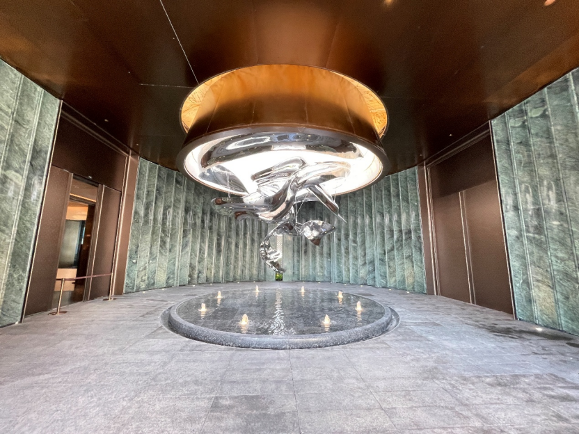 三进院,步入约120㎡的波光灿影巨厅。墙面大面积铺陈宝格绿石材,中厅的艺术装置宛如“运河之水天上来”。