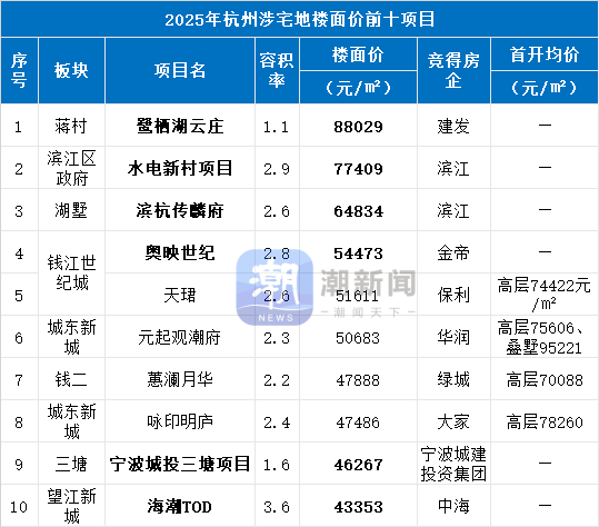 潮新闻记者统计梳理,2024年杭州涉宅地楼面价前十项目,除了中海万潮玖序之外,已全部开盘。而2025年杭州涉宅地楼面价前十项目,目前仅开出了4盘,更多顶豪项目如滨江水电新村、建发鹭栖湖云庄等,则将目光抛向了2026年,等待新的房地产支持政策到来,也等待一个比较有利的入市节点。