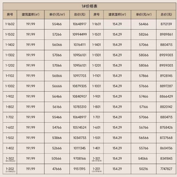 即将推出1#30套高层房源,户型面积160㎡、192㎡,精装均价55666元/㎡。其中,160㎡户型总价780万元起,192㎡户型总价915万元起。