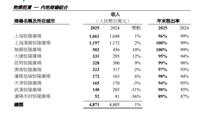 截至2025年12月31日,恒隆内地业务商场部分整体收入上升1%,大部分商场录得增长。不过,天津恒隆广场、武汉恒隆广场与沈阳市政恒隆广场,因地区竞争加剧令收入下跌,抵消了部分升幅。