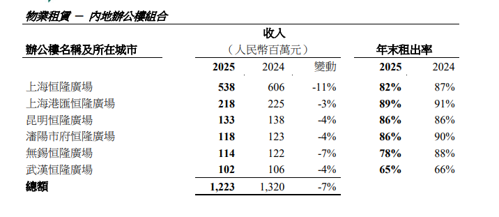 由于经济持续不明朗和供应过剩,2025年恒隆内地办公楼租赁市场停滞不前,旗下高端办公楼组合收入下降7%,在上海等一线城市影响尤甚。