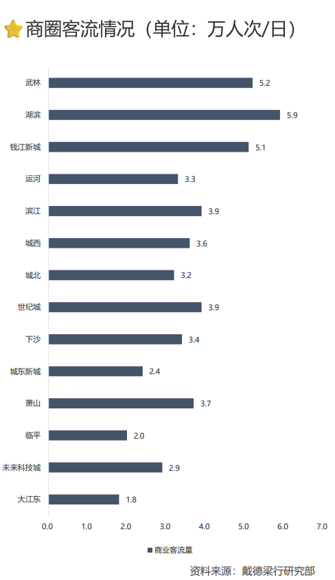 区域商圈,诸如运河新城、下沙等板块,客流量同比上涨了0%-2%左右,客流稳定但增速也在放缓。其中,客流量前三的区域商圈为:滨江、世纪城、萧山。滨江、萧山商圈的日均客流量皆为3.9万人次,萧山商圈的日均客流量为3.7万人次。