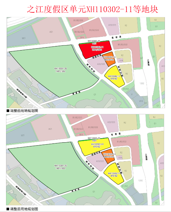调整范围:规划项目位于之江度假区单元内,本次拟调整XH110302-11地块东至梧桐支路,南至梧桐环路,西至枫桦西路,北至梧桐路沿线绿带。由于区域道路断面、公共服务设施的优化,对XH110302-14、XH110302-17、XH110302-32和XH110301-35块进行关联调整。