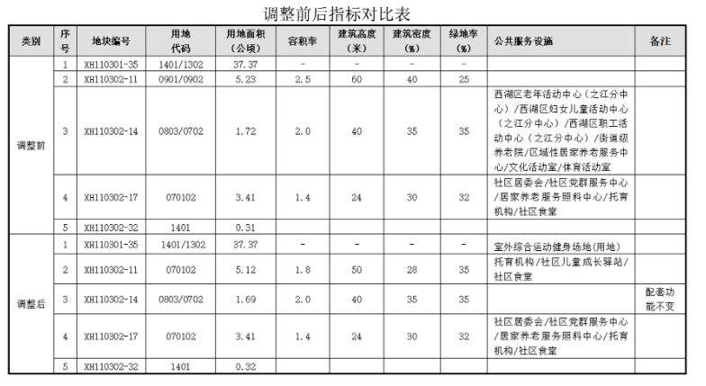 调整内容:拟将XH110302-11地块由商业用地兼容商务金融用地调整为二类城镇住宅用地,优化枫桦西路、梧桐环路局部道路红线,对XH110302-14、XH110302-32地块用地面积进行关联调整,并对XH110302-17、XH110301-35地块公共服务设施进行优化。