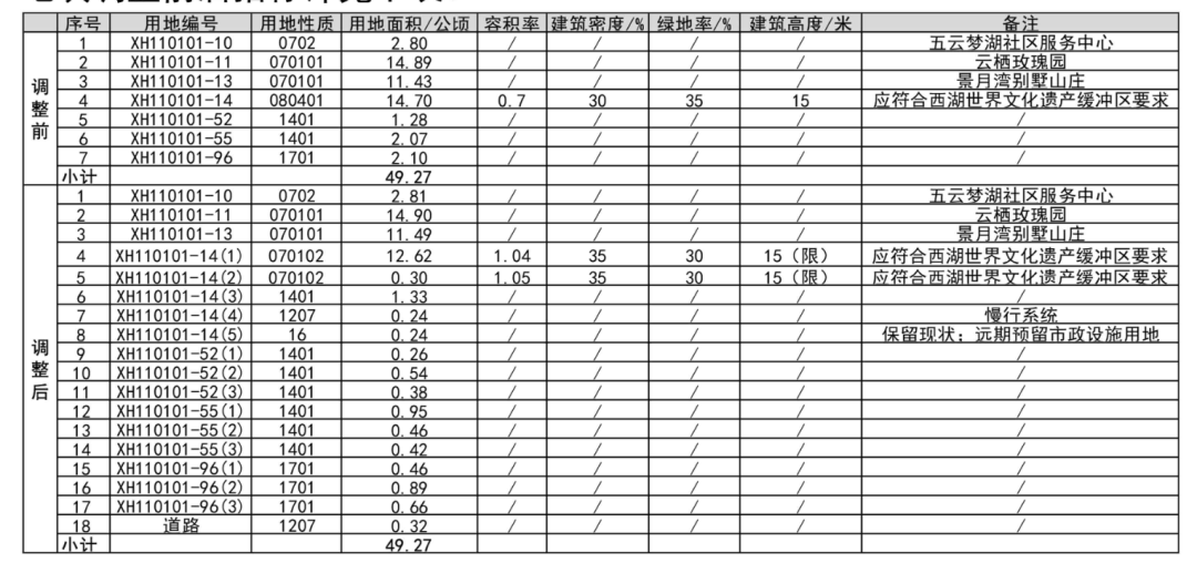 值得注意的是:住宅部分建筑高度因为要符合西湖世界文化遗产缓冲区要求,建筑限高仍为15米。此外XH110101-14(1)住宅地块中间还有1宗公园绿地规划。