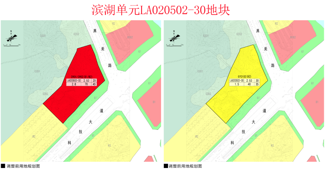 调整原因:促进职住平衡,优化片区用地结构。调整内容:拟将用地性质由商业商务用地(B1/B2)调整为二类城镇居住用地(R2),将原建筑限高70米调整为40米,并优化其他控制指标。