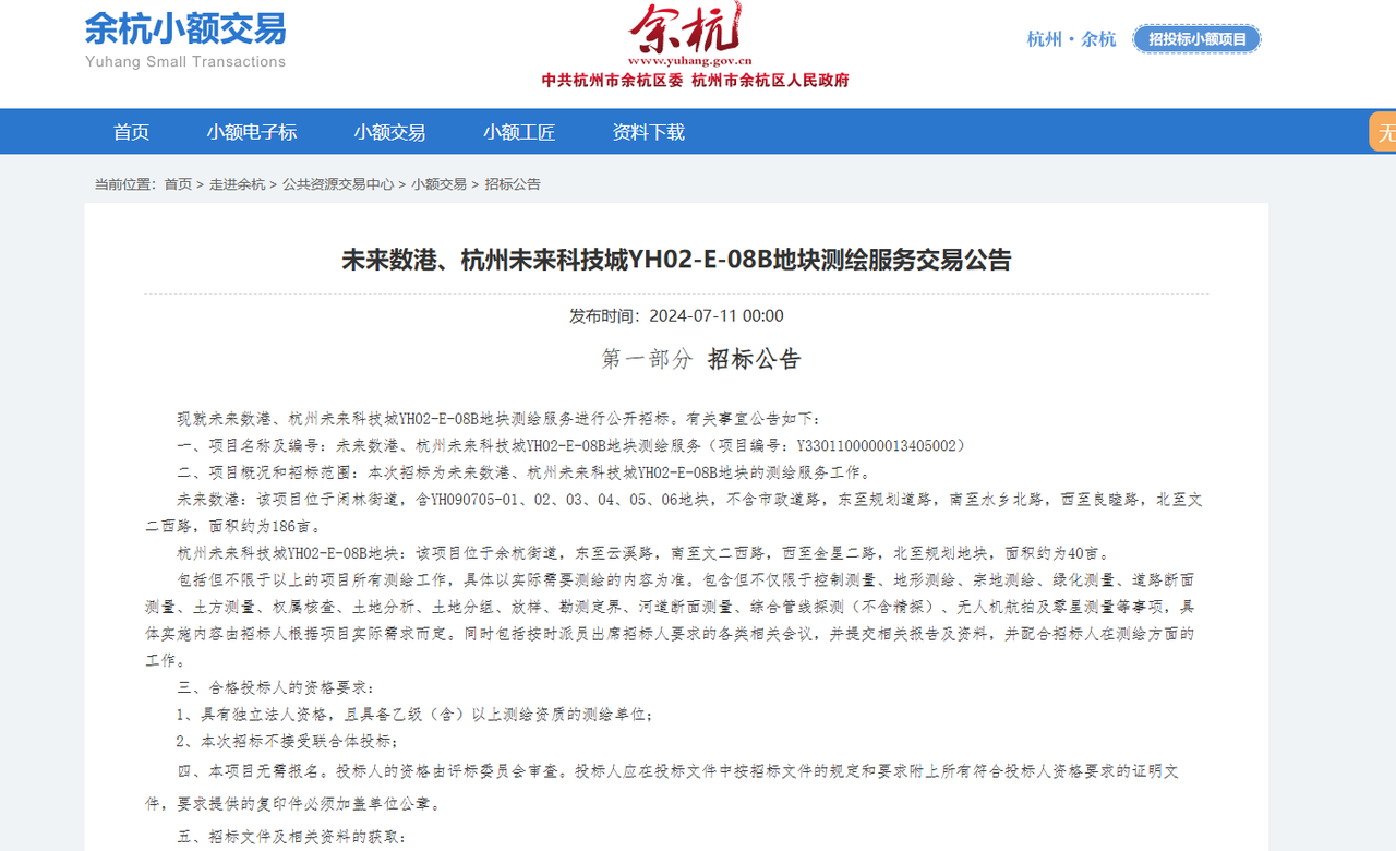 2024年7月11日,余杭区发布未来数港、杭州未来科技城YH02-E-08B地块测绘服务交易公告。其中提到,未来数港该项目位于闲林街道,含YH090705-01、02、03、04、05、06地块,不含市政道路,东至规划道路,南至水乡北路,西至良睦路,北至文二西路,面积约为186亩。