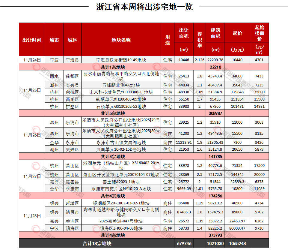 住在杭州网11月24日讯(记者 岑天宇) 据浙报传媒地产研究院追踪统计,本周(11.24-11.30)浙江省拟出让涉宅地18宗(剔除纯租赁、纯安置,出让面积小于1000㎡的涉宅地,下同),体量102万㎡,总起价106.5亿元,平均起始楼面价10115元/㎡。
