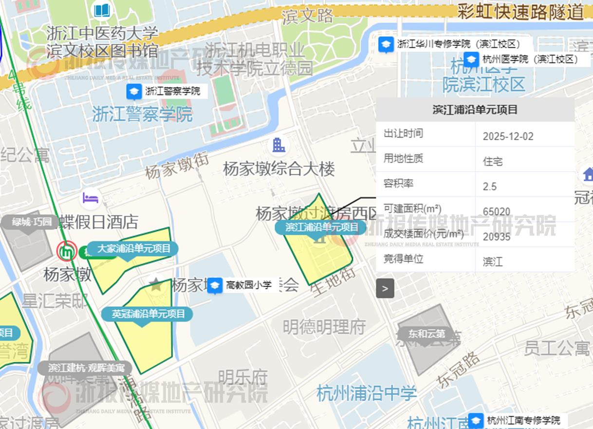 2025年12月2日,杭州滨江房产集团股份有限公司(滨江房产)以总价136119万元竞得浦沿单元BJ040301-05(1)地块,成交楼面价为20935元/㎡,溢价率0.0%。
