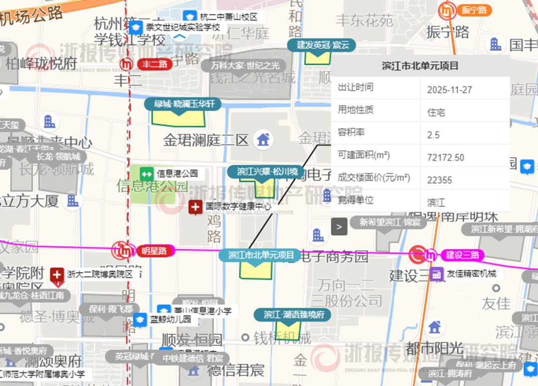2025年11月27日,杭州滨江房产集团股份有限公司(滨江房产)以总价161345万元竞得萧山区开发区市北单元XS070104-07地块,成交楼面价为22355元/㎡,溢价率11.8%。