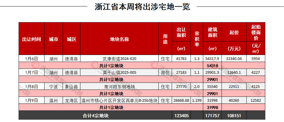 住在杭州网1月5日讯(记者 岑天宇)据浙报传媒地产研究院追踪统计,本周(1.5-1.9)浙江省拟出让涉宅地4宗(剔除纯租赁、纯安置,出让面积小于1000㎡的涉宅地,下同),体量17万㎡,总起价10.8亿元,平均起始楼面价6722元/㎡。