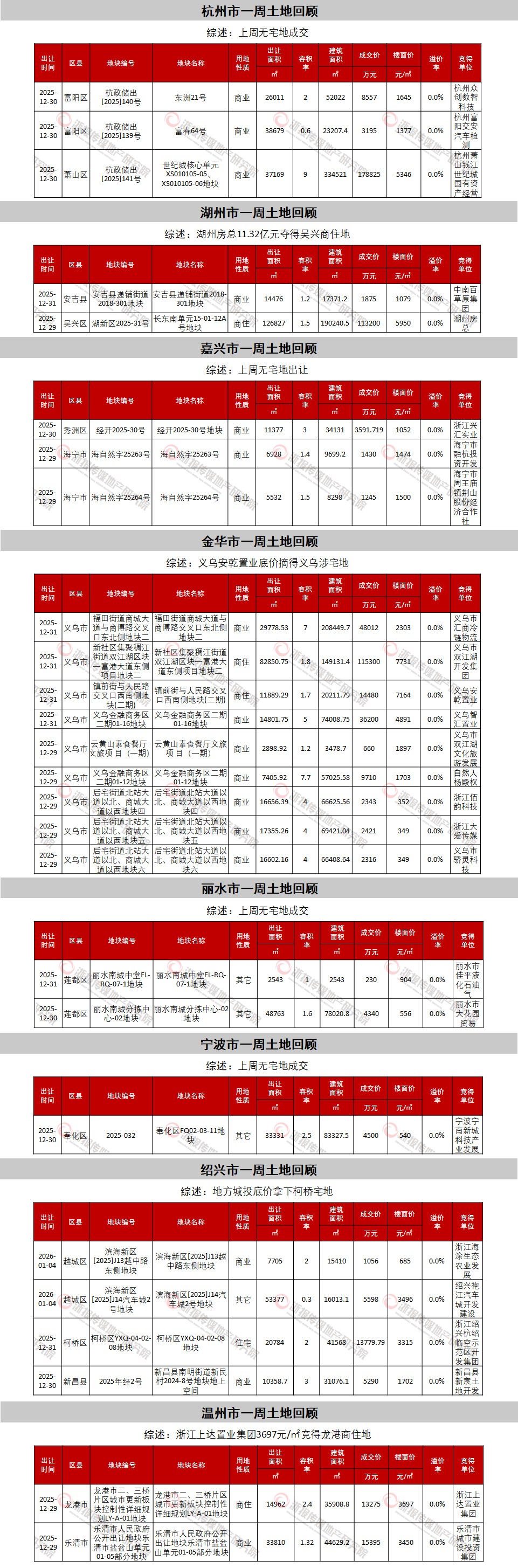 2025年最后一周,宅地全部底价成交:义乌市双江湖开发集团、义乌安乾置业底价分摘金华义乌两地、浙江绍兴杭绍临空示范区开发集团底价竞得绍兴柯桥宅地;浙江上达置业集团底价拿下温州龙港商住地;湖州房总11.32亿元斩获湖州吴兴涉宅地。
