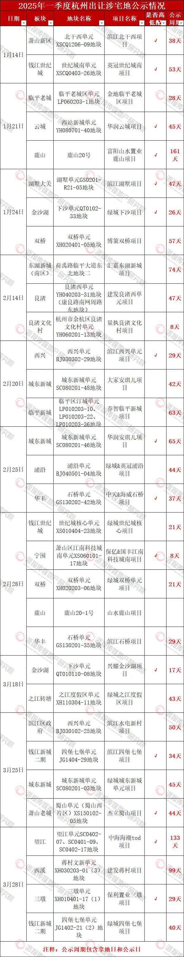 一季度共出让32宗涉宅地,除了山水鹿山项目以外,全部已经在年内公示。31宗涉宅地的平均公示周期为47.6天。
