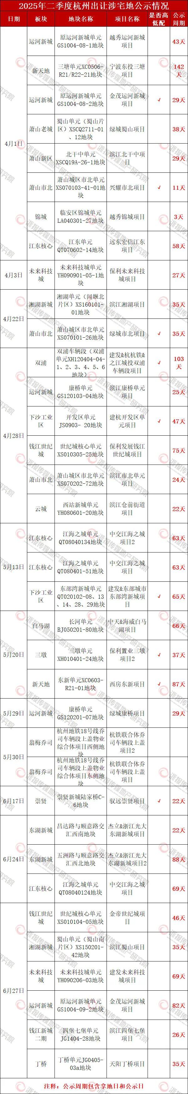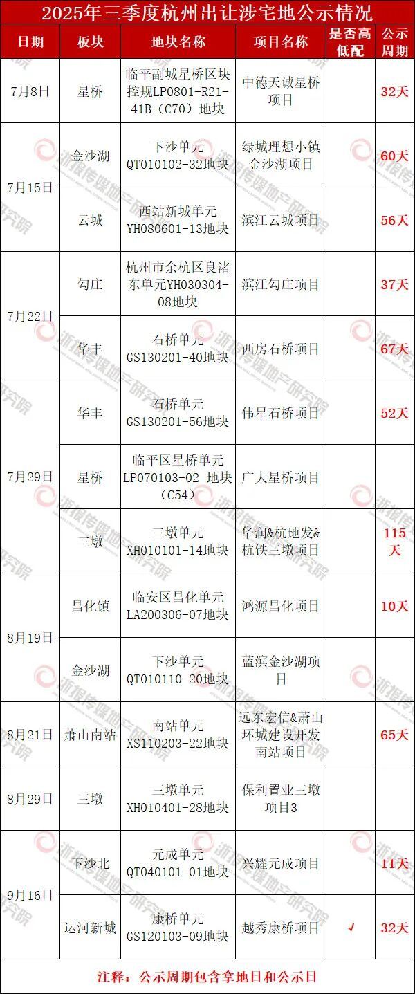 二季度共出让36宗涉宅地,除了杭铁联合体乔司车辆段上盖姊妹项目以外,全部已经在年内公示。34宗涉宅地的平均公示周期为48.5天。