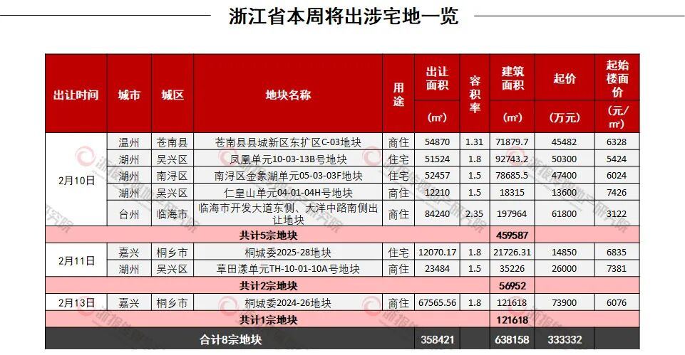 住在杭州网2月9日讯(记者 岑天宇) 据浙报传媒地产研究院追踪统计,本周(2.9-2.15)浙江省拟出让涉宅地8宗(剔除纯租赁、纯安置,出让面积小于1000㎡的涉宅地,下同),体量63.8万㎡,总起价33.3亿元,平均起始楼面价6077元/㎡。